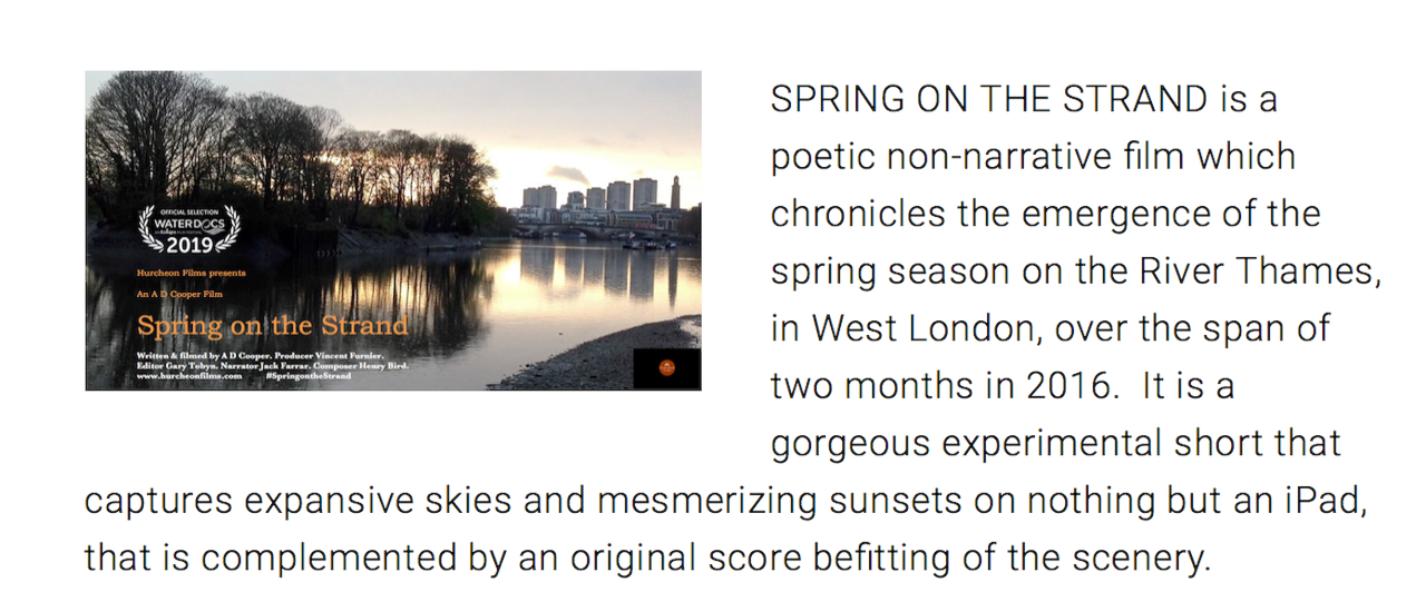 This two-minute film is designed to be a lyrical piece about the spring arriving in West London, filmed entirely on an iPad. Some stills of the Strand on the Green waterfront are seen here.