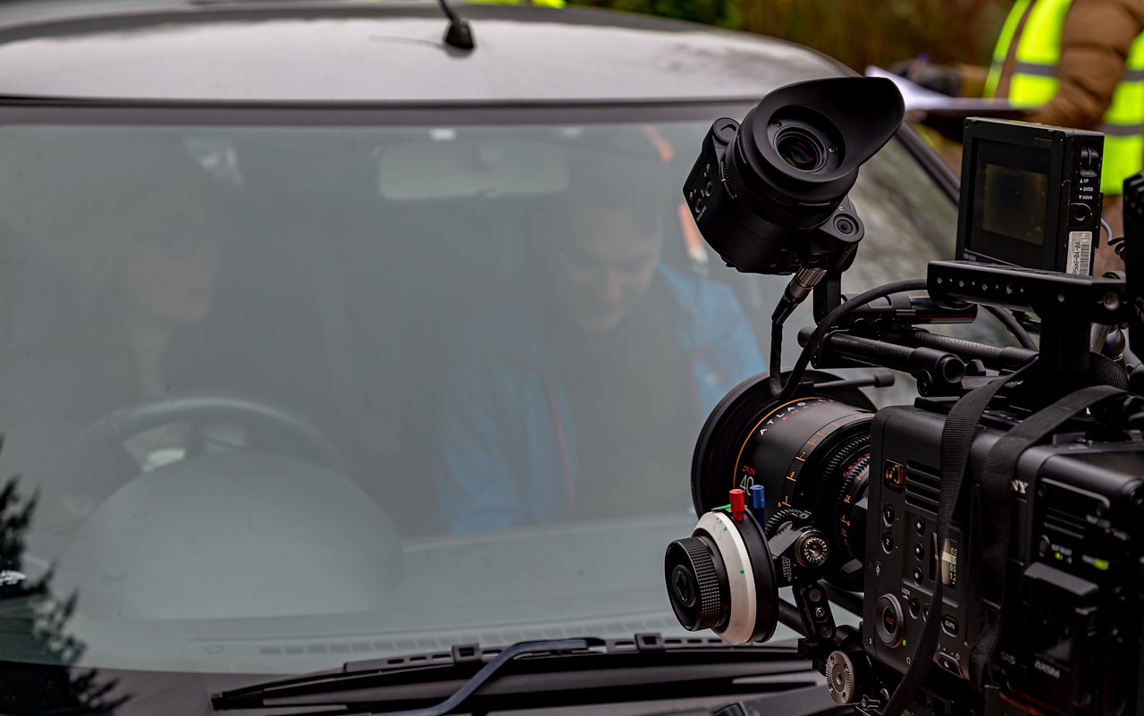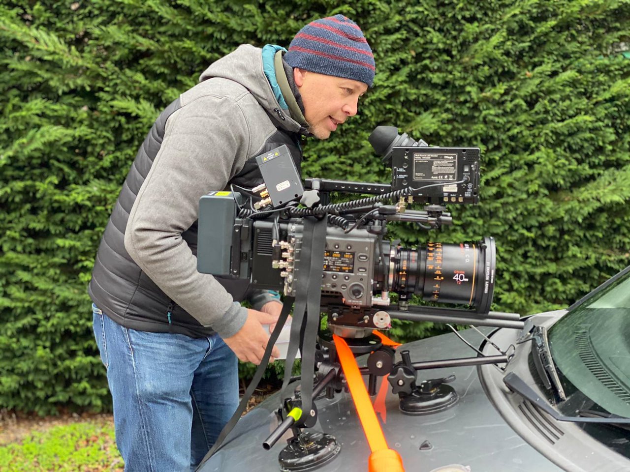 Cinematographer Derk Russell secures the car mount. Image by Steve Jaipaul. How we would regret the orange straps which showed up in all kinds of reflections on the windscreen and the driver's glasses.