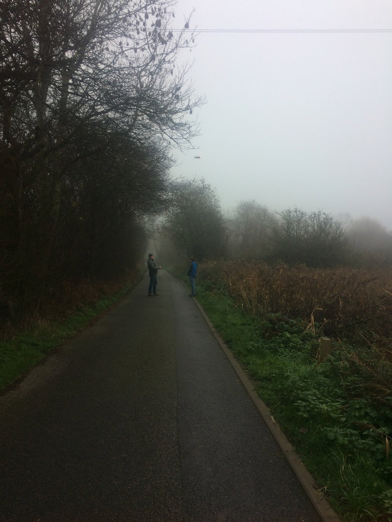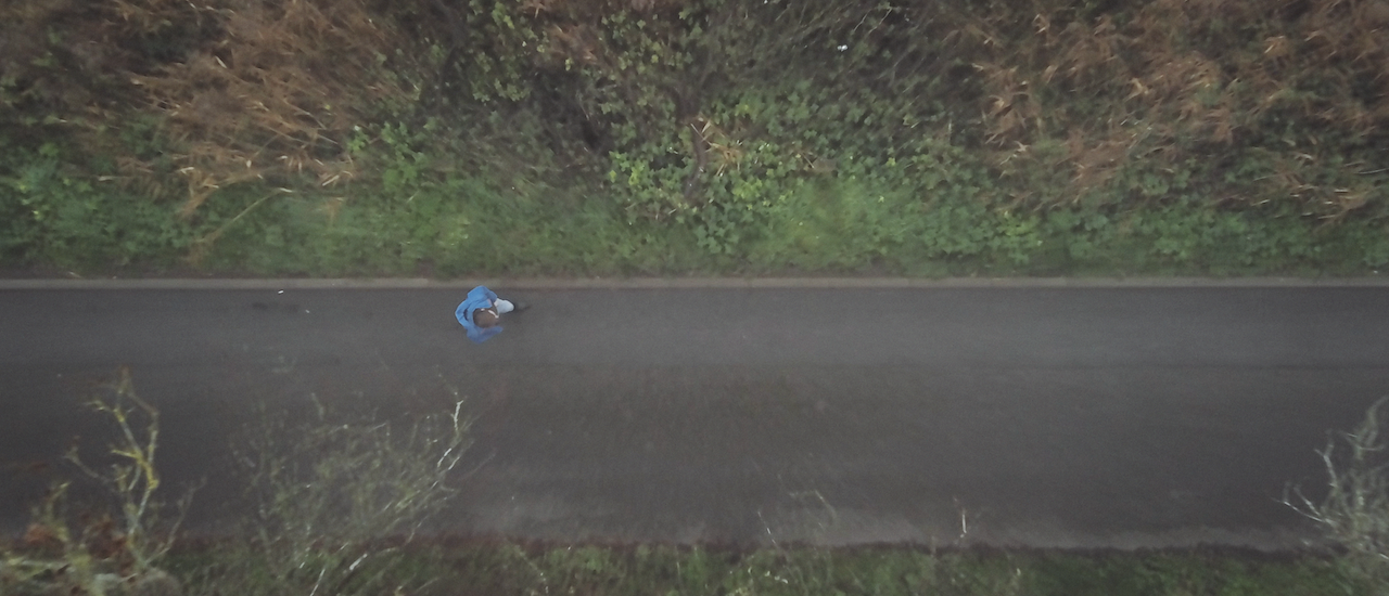 The opening drone shot in progress. We got the actor to walk backwards as the drone took off and then reversed the film in the edit.