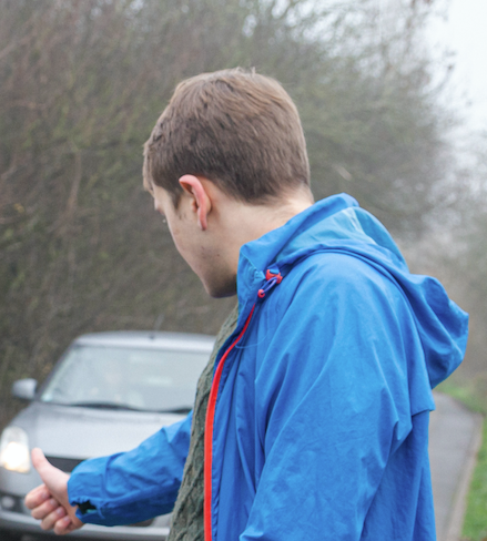A man is lost in a desolate landscape. His only hope is hitching a lift.